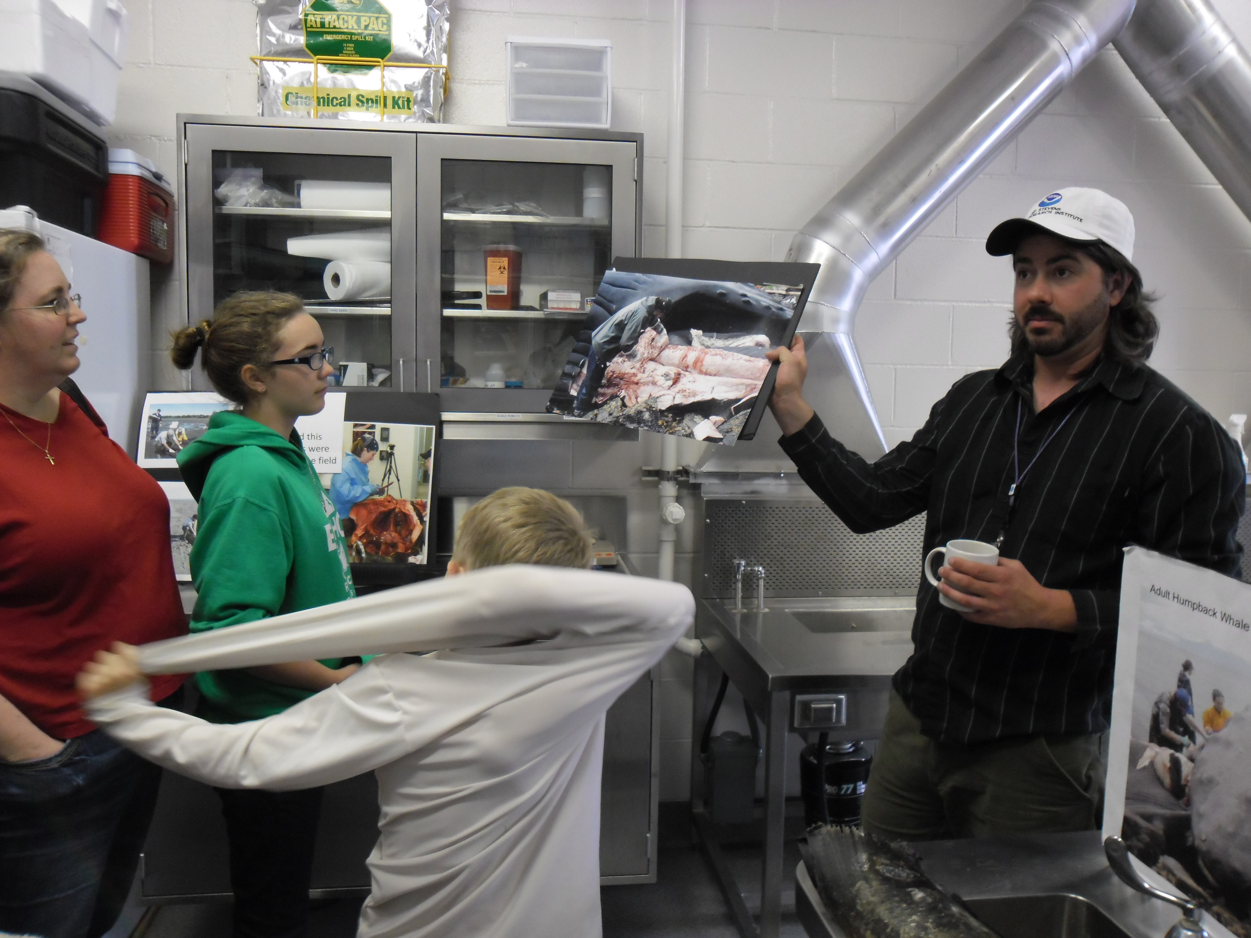Wyatt Fournier is a NOAA fisheries biologist at the Auke Bay labs. On this day, he’s also a tour guide. He guides a group to the necropsy lab.