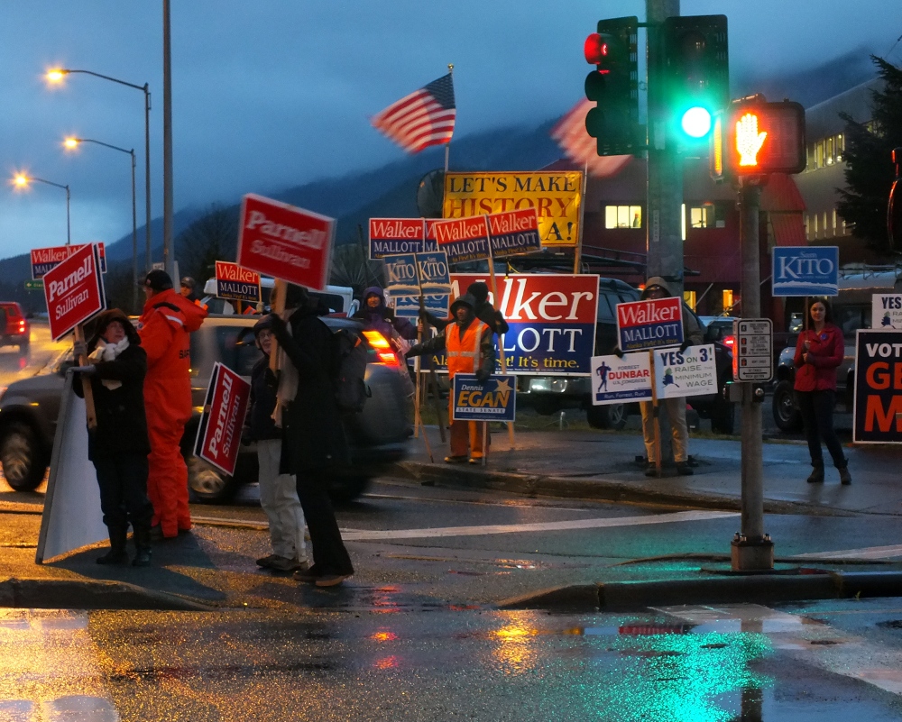 Campaign signs and political sign waving are a common practice in any election campaign. Here’s just a small sample of signs in the Juneau area and sign waving that occurred at 10th Street and Egan Drive on Election Day 2014 during the afternoon commute.