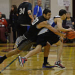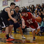 James Gang’s Billy Elhyers (0) is defended by Filcom’s Mike Vanderjack during Filcom’s 59-51 win in a C Bracket game of the Juneau Lions Club 71st Annual Gold Medal Basketball Tournament at JDHS on Sunday, March 19, 2017. (Photo courtesy Klas Stolpe)