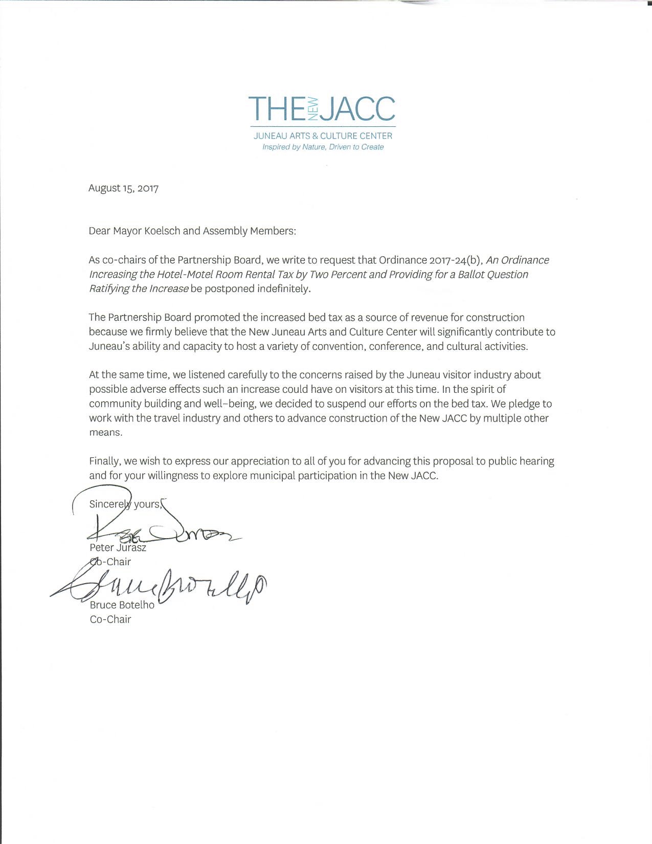 The heads of the board overseeing the project wrote the Juneau Assembly on Tuesday requesting the ordinance related to the tax increase be postponed indefinitely.