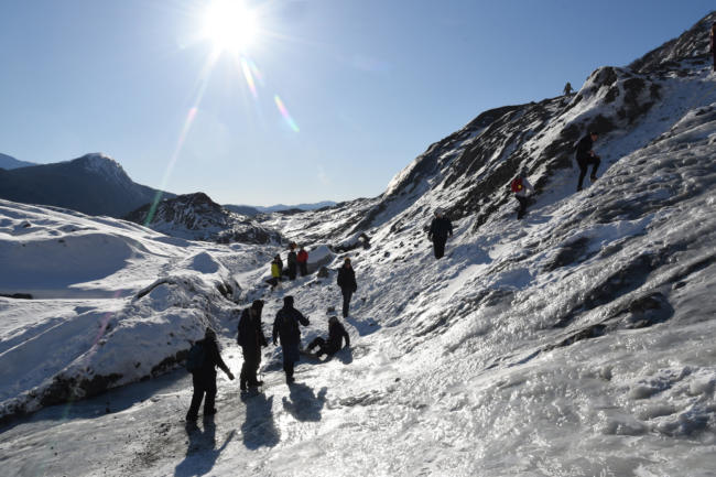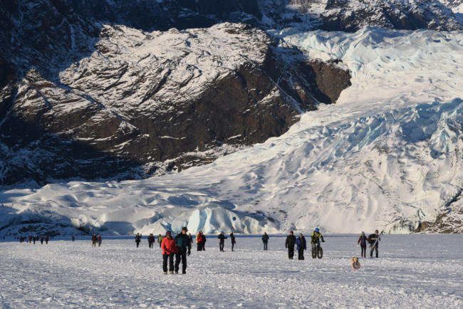 On a sunny day in February, several dozen people were walking across frozen Mendenhall Lake toward the western corner of the glacier.