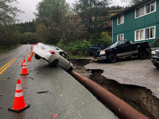 Heavy rains caused flooding, mudslides and in one Douglas Island neighborhood, a road collapsed early Sunday morning.