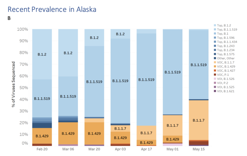 Health officials said Thursday that they’re seeing a sharp increase in the share of Alaska’s COVID-19 cases linked to a more contagious and potentially more deadly strain of the coronavirus first seen in Britain.