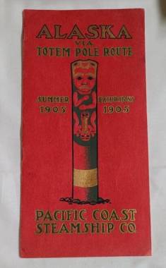 Steamship tourism kicked off in the late 1800s, with mostly wealthy European and American tourists making the long journey to Southeast Alaska. James points to a 1905 pamphlet advertising ‘Alaska via the Totem Pole Route’ where ships visited different villages to see original totem poles.