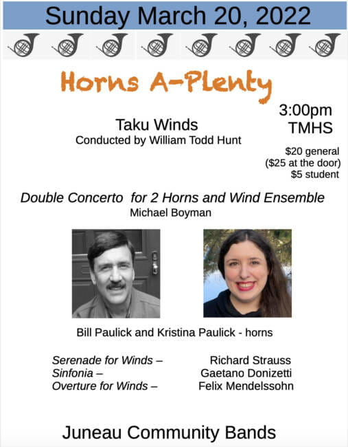 Kristina Paulick has had a lifelong, but friendly musical rivalry with her dad, Bill, who has played French horn for decades. Now they get to show off their musical virtuosity in an upcoming Juneau Community Bands concert that features the works of composers, showcasing French horns.