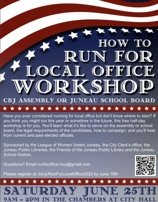 Guests: Peggy Cowan, League of Women Voters Juneau, Board Member. Kristin Bartlett, Chief of Staff, Juneau School District,The League of Women Voters, in partnership with the City and Borough of Juneau and the Juneau School District, is offering a workshop on how to run for local office. The primary focus of this free, half-day session is on assembly and school board races.
