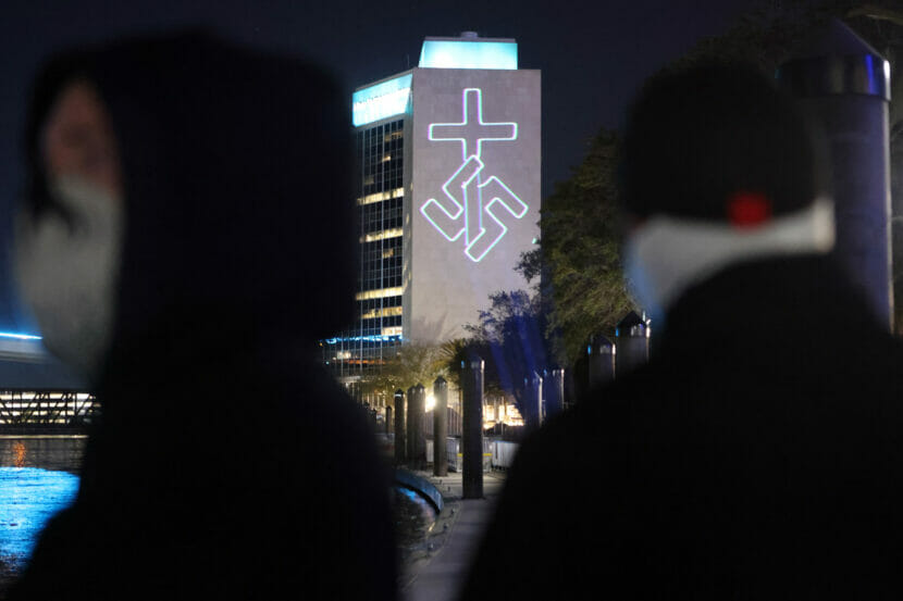 As the nation grapples with how to confront the rise of domestic extremism, local city governments face their own challenges with people like Josh Nunes. The city of Jacksonville has passed a city ordinance that makes it illegal to project images onto buildings without the building owner’s consent — a misdemeanor offense. But it’s unclear how such a move will bear up under legal scrutiny. Many political groups have used projectors in public areas as forms of demonstration, an act that lower courts have historically upheld as protected by the First Amendment.