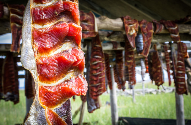 Summer chum salmon drying on a fish rack. (Matthew Smith/KNOM)