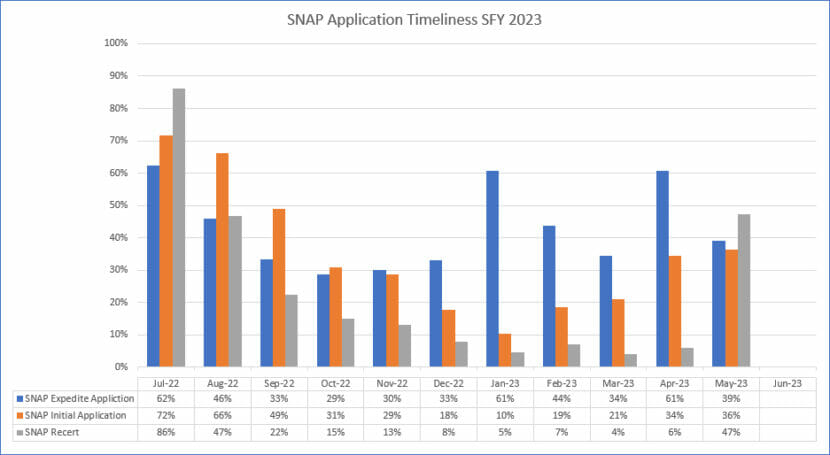 Families must have their income checked periodically in order to keep receiving food stamps. But sharp delays in those recertifications kept families waiting months for food aid. In March, only 4% were done on time. But the most recent Division of Public Assistance data shows a rebound — now nearly half of the recertifications are processed within a month.