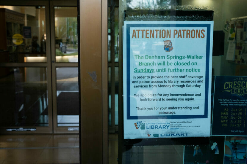 This spring, Livingston Parish announced the closure of the last branch in the library system that was open Sundays. “We are down quite a few man hours,” Parrish explained at the time, “and we are also down man hours in all of our other branches also, so moving people from branch to branch is not an option.”