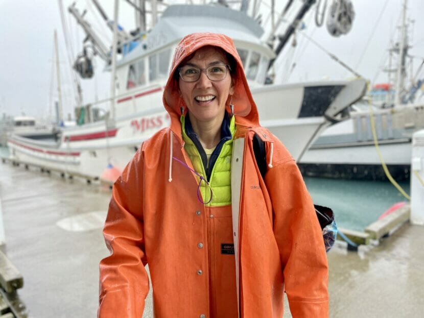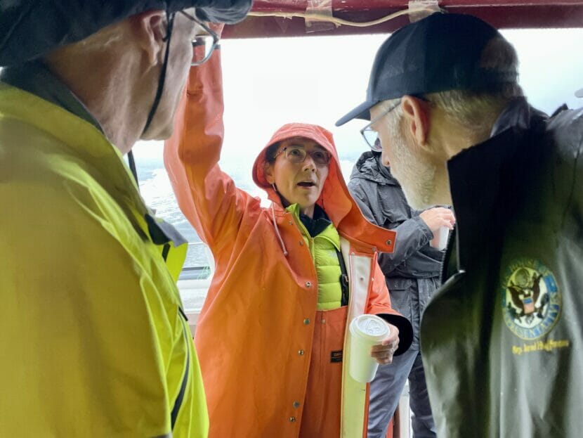 In heavy orange rain gear, Congresswoman Mary Peltola mingled with guests on the deck of the Tenacious, a charter boat in Seward. Even before the boat left the Seward harbor, the skipper warned of significant swells.