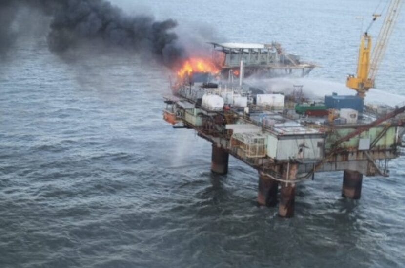 Hilcorp’s Baker platform caught fire in 2014, after it had been revived to produce natural gas. (Courtesy of Nikiski Fire Department)