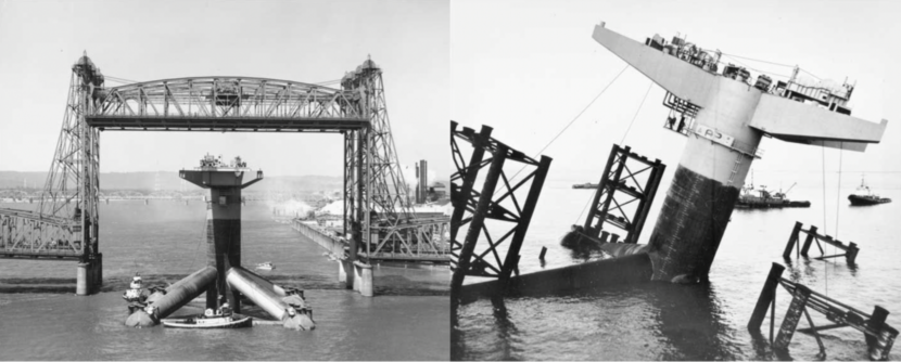 The Monopod platform was built in Washington state during the 1960s for oil companies Marathon and Unocal. It then had to be floated down the Columbia River to the Pacific Ocean and nearly 2,000 miles to Alaska. Once in Cook Inlet, its pontoons were flooded and it was sunk into place. (Courtesy of Alaska State Library, Ackroyd Photography Inc., left photo; right photo uncredited.)