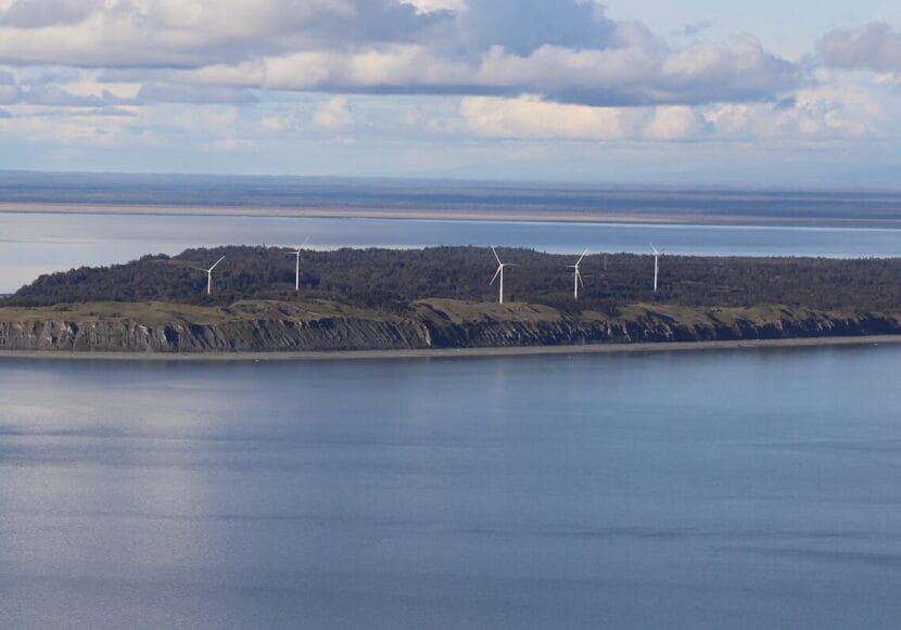 Wind turbines spin on Fire Island in Cook Inlet. (Nathaniel Herz for Alaska Public Media)