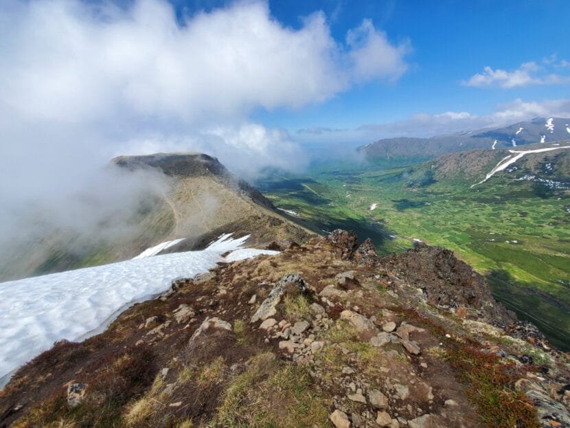 The back side of Flattop Mountain is seen through cloud cover on June 17 from the top of adjadent Peak 2 in Chugach State Park. The back side is sometimes called “Sunnyside.” Parking spaces on that side of the mountain are sparse. (Photo by Yereth Rosen/Alaska Beacon)