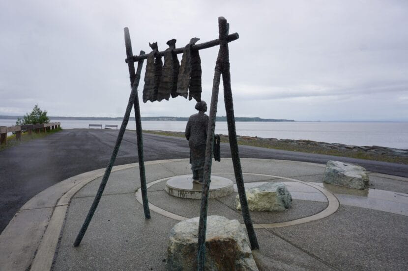 Upper Cook Inlet, off downtown Anchorage, is seen on June 26, 2023, beyond a statue of Olga Nicolai Ezi, a Dena’ina matriarch and an important figure in local history. This area at the Ship Creek boat launch is envisioned in the Alaska Long Trail plan as a connecting site linking the Ship Creek Trail and Tony Knowles Coastal Trail. The plan also envisions this site as an expanded gateway focused on Indigenous culture. That project won funding in this year’s capital budget. (Photo by Yereth Rosen/Alaska Beacon)