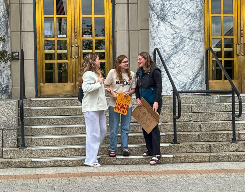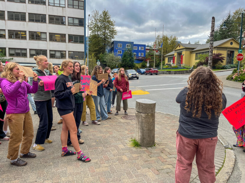 Dozens gathered on the sidewalk across from the Alaska State Capitol building Wednesday holding pink and cardboard signs saying, “healthcare is a right, not a privilege” and “reproductive freedom by any means necessary.”