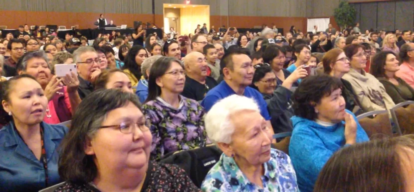Audience watches a dance group perform at the Alaska Federation of Natives convention in October 2018 at the Dena’ina Convention Center in Anchorage, Alaska. (Photo from video by Joaqlin Estus/ICT)