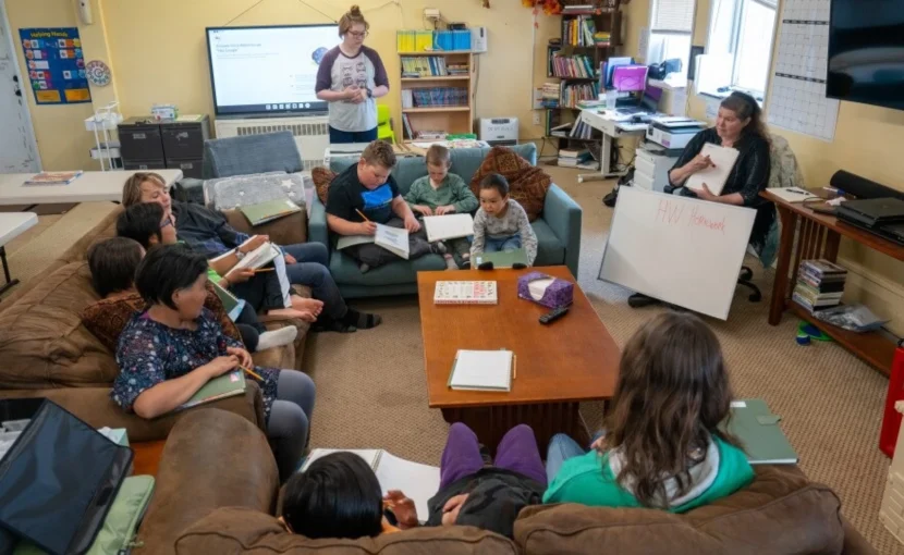 One afternoon last September, the school’s 10 students — from kindergarten through 11th grade — sat listening on sofas as teacher Lynette Hall prepared them for the next day’s lessons. She asked them to take out their planners.
