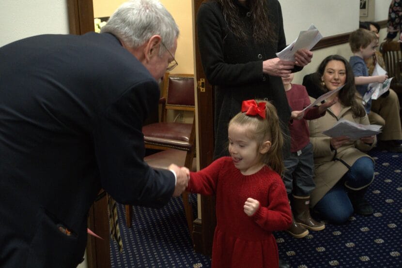 Her kid, three-year-old Izabella Adams-Hall, wore a red dress with a matching bow in her hair. She got to shake the hand of Rep. Dan Saddler, R-Eagle River, after delivering a bright pink valentine.
