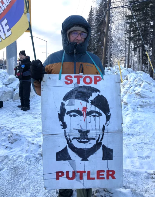 She held a banner that said: “Solidarity Alaska and Ukraine, many great values, one bad neighbor in common.” Ryan Tinsley held up the other end.
