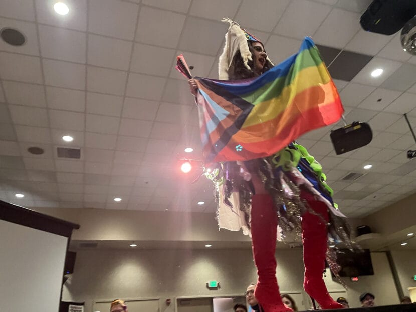 Lingít drag performer Lituya Hart Monroe joined dancers in an ermine pelt headdress, holding a pride flag.