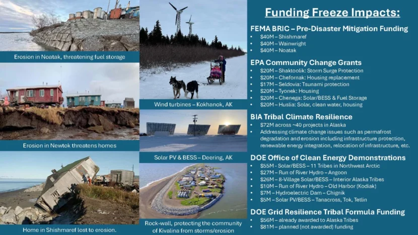 Other frozen grants would fund projects for preventing shore erosion and stabilizing villages against permafrost melt, flooding and extreme weather, said Tashina Duttle, chief operating officer at DeerStone Consulting, which works on tribal energy infrastructure projects across the state.