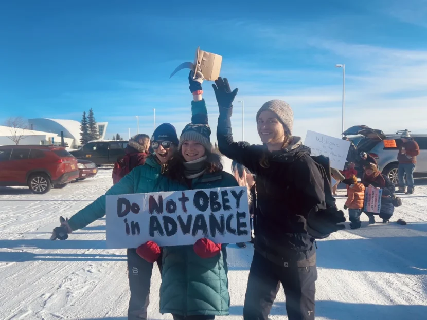 A few dozen University of Alaska Fairbanks students, faculty and their dogs gathered in a frozen parking lot on campus in late February. It might’ve looked like a tailgate party — if not for the signs in their hands.