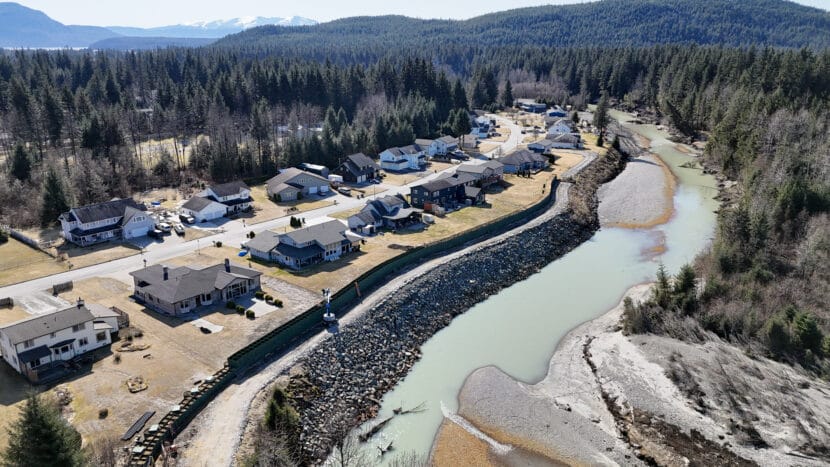 Thunder Mountain Middle School sits beside Mendenhall River, which has surged over its banks and devastated homes in the Valley twice over the past two years. Floodwaters came close to inundating the school last year.