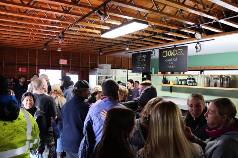 The restaurant is downstairs. Its menu will feature locally sourced ingredients and traditional foods. During the opening night reception, guests queued up to order. Halibut and black cod chowder were on the menu. Drinks included locally made beverages such as spruce tip soda and chaga root beer.