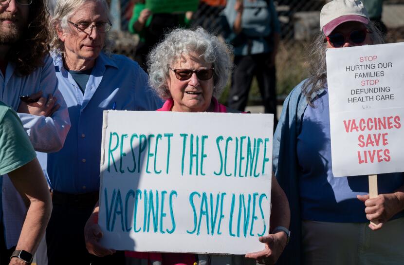 “My sign says, ‘Respect the science. Vaccines save lives.’ That’s why I’m here,” she said. Kennedy, she said, “has not given any sign that he respects science. He’s killing people by what he’s doing to vaccines and the research.”