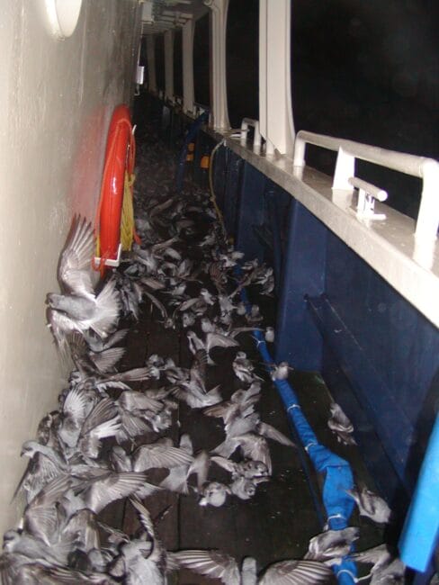 The birds seemed attracted to the ship’s lights like moths to a flame. So the scientists shut them off. Then they blew hair dryers to warm up the dazed, wet and cold storm petrels before releasing them. It was autumn, so many of them had just fledged their nests.