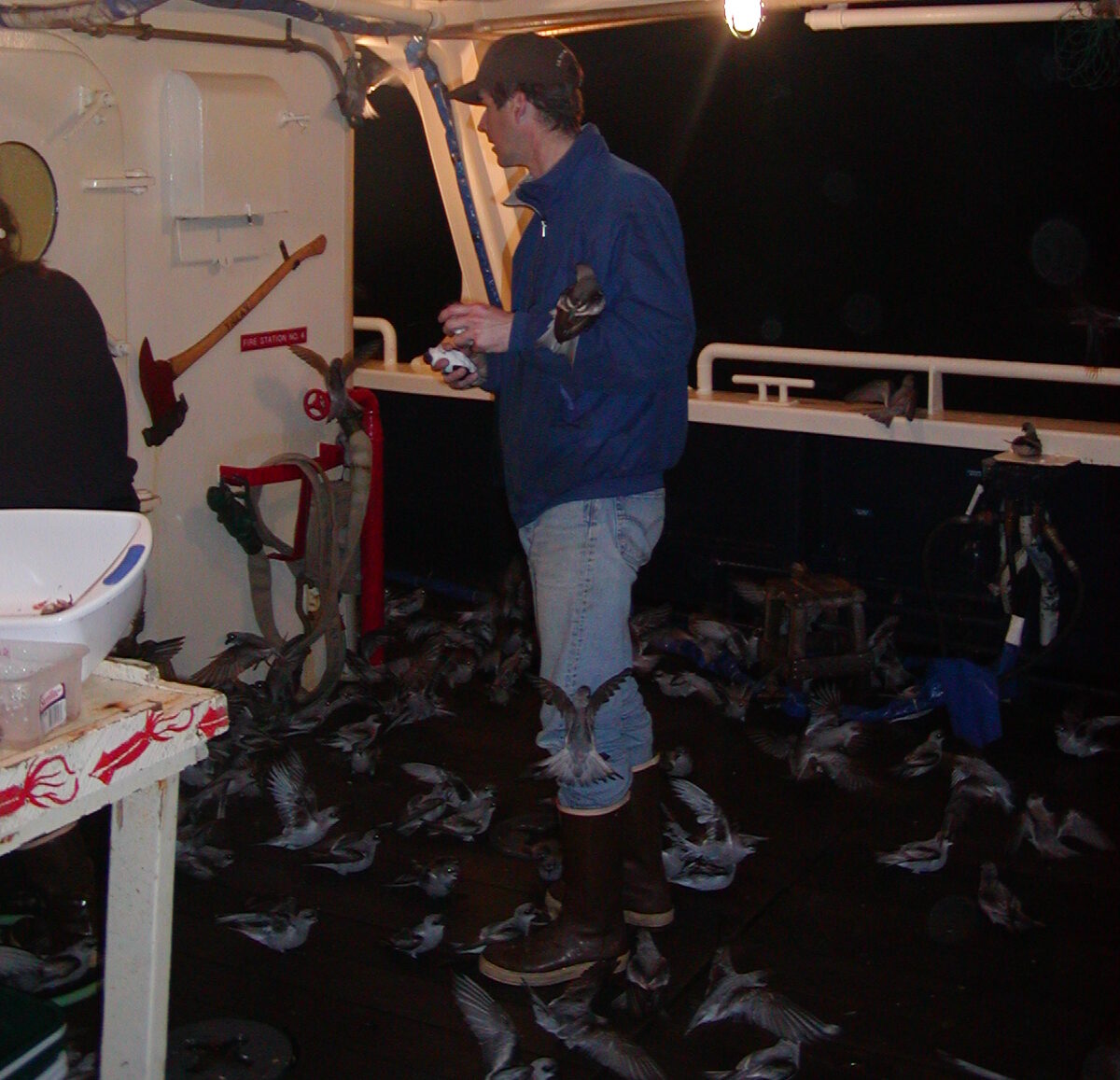 “It was around one of the breeding colonies, and we had to have the lights on to retrieve the nets,” he recalled. “It was one of these foggy nights, birds just come flying in.”