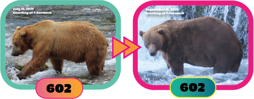 602 Flotato has perfected the art of eating a colossal amount of food and then doing absolutely nothing. He maximizes his net caloric intake by burning the least amount of energy possible. After gorging at the falls, some bears go on a walkabout, but 602 is like, what if I … didn’t. He’s got a beer belly dad bod – built for comfort, not speed. When he sheds at the end of summer, it looks like he’s not wearing pants. He, predictably, has a lot of nicknames. But secretly I call him The Dude.