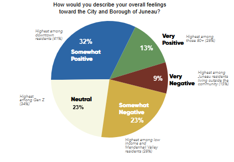 Residents were also asked how they felt about the City and Borough of Juneau overall. Forty-five percent of respondents said they felt somewhat or very positive, while 23% felt neutral and 32% said they felt somewhat or very negative.