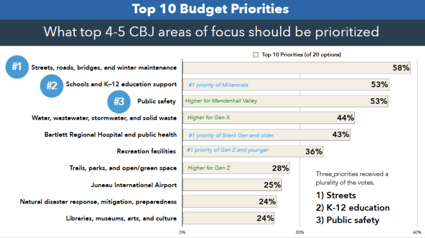 Winter maintenance of streets, supporting schools and public safety are the top budget priorities of more than 4,000 Juneau residents who took a city budget survey earlier this year.