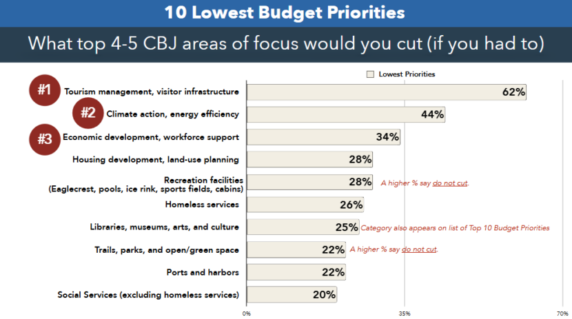On the flip side, surveyors were also asked to rank what services from that same list they’d support budget cuts to. The data shows 62% of respondents chose tourism management, and visitor infrastructure, followed by 44% who chose climate action and energy efficiency. About a third chose economic development and workforce support as their lowest priorities for funding.