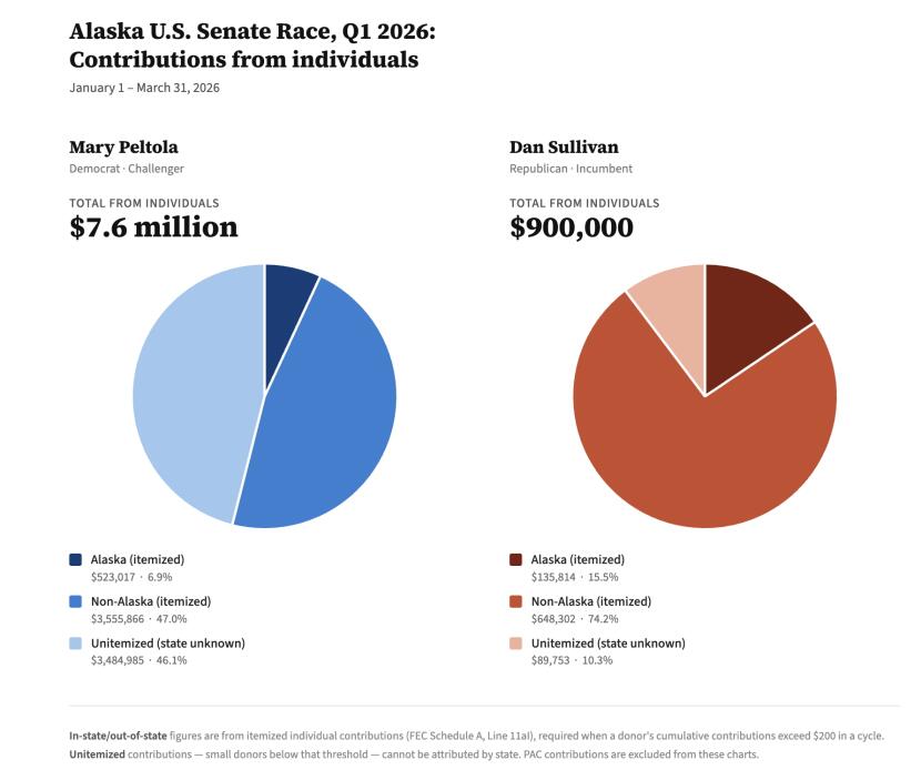 But Alaska contributions make up a greater share of Sullivan’s quarterly total. About 17% of his total came from in-state, while 13% of hers did. (Those figures don’t include unitemized contributions.)