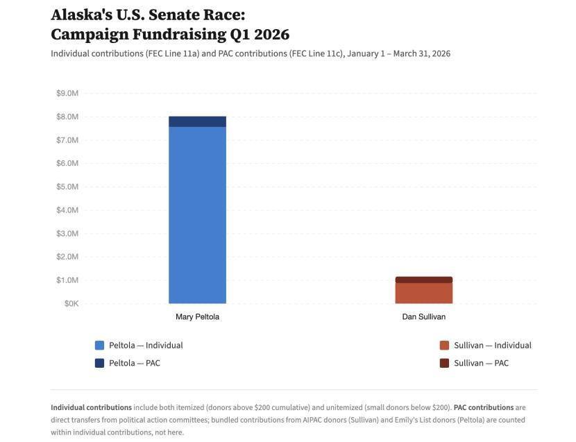 Looking at just the first-quarter of 2026 doesn’t tell the whole story. If you include last year, before Peltola got in the race, Sullivan has raised a total of $6.5 million. And if you add all of his fundraising since his last election, he has slightly outraised Peltola’s first quarter.